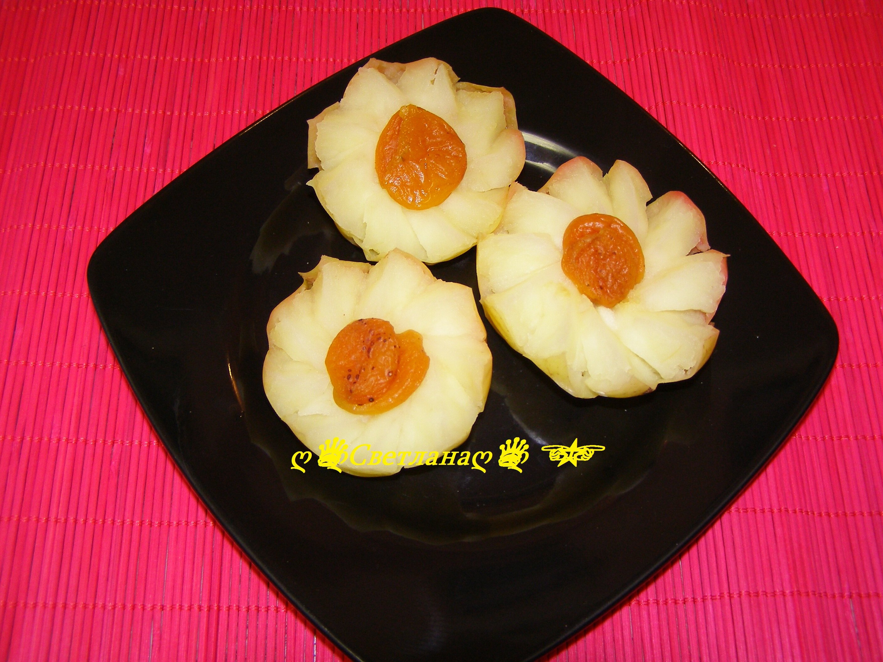 Спасибо Вам Светлана за такой простой и очень вкусный рецепт десерта! Яблоки брала зеленые с плотной мякотью, в центр положила грецкий орех и полила немного медом. Готовила 20 минут в режиме «Варка на пару», так как 10 минут не хватило для полной готовности из за сорта яблок. Спасибо Вам еще раз!