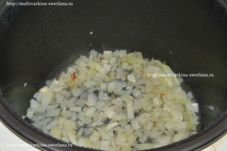 Чистим луковицу. Режем ее либо полукольцами (мои домашние такой способ не любят), либо измельчаем ножом. В кастрюлю от мультиварки помещаем кусочек сливочного масла и лук. Включаем режим «Выпечка» 20 минут. Минут пять лук обжаривать, до подрумянивания, после чего наливаем воду и притушиваем его. Это нужно для того, чтобы лук в готовом блюде не был жестким: