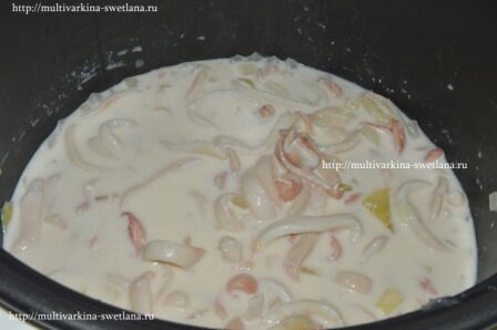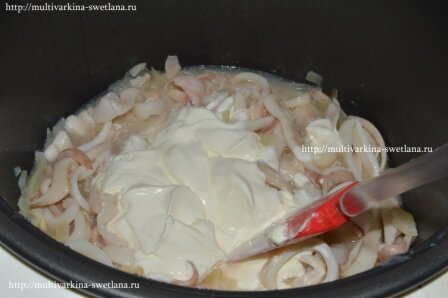 Пока он нагреется, пройдет минут 5, так что жестким кальмар стать просто не успеет. И за 2 минуты до готовности добавляем сметану: