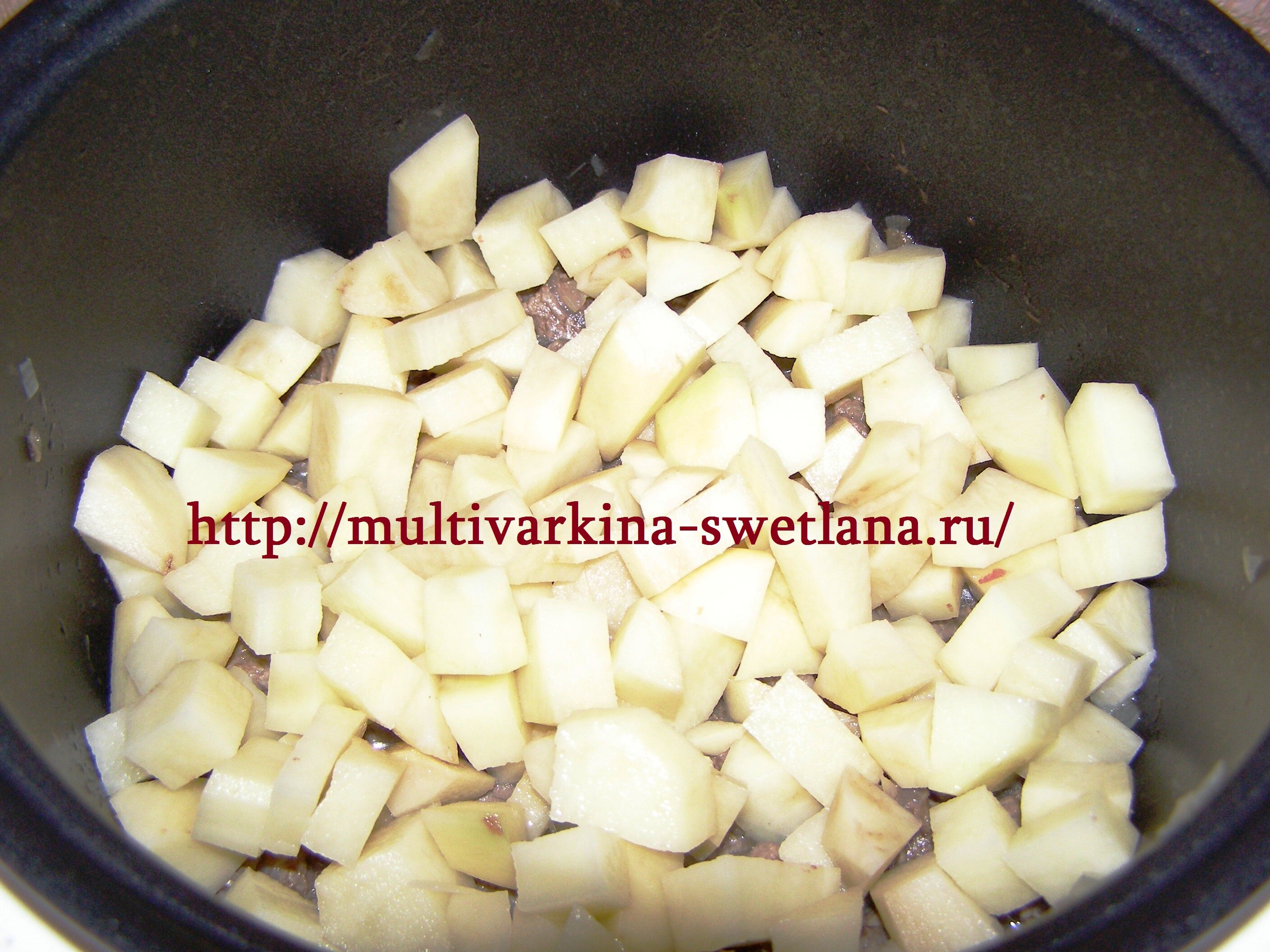 Пока обжаривался лук с чесноком, разделали мясо на кусочки и добавили в мультиварку, перемешать бы не забыть и обжаривать до сигнала таймера.